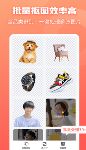 功能比较强大的自动识别抠图软件,支持多种不同的品类主体,包括宠物、家具、日用品、人物等,而且更加令人惊喜的是这款软件还加入了批处理的工具,可以大幅提升图片处理以及提取的效率和速度。