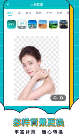 在导入图片之后这款软件就可以自动帮助我们识别出其中的主体并且切割为不同的部分供我们选择是去除还是保留。另外这里还带有大量的背景素材,不管是名胜古迹还是一些季节风景都可以轻松找到。