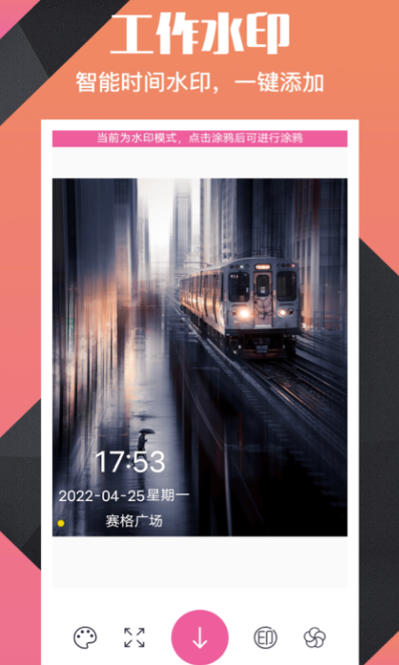 无论是工作记录还是学习等需求都是可以通过这款软件拍摄店家水印,自定义的添加大家所喜欢的水印。这里的颜色和位置和大小都是可以任意选择的。