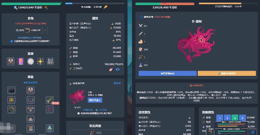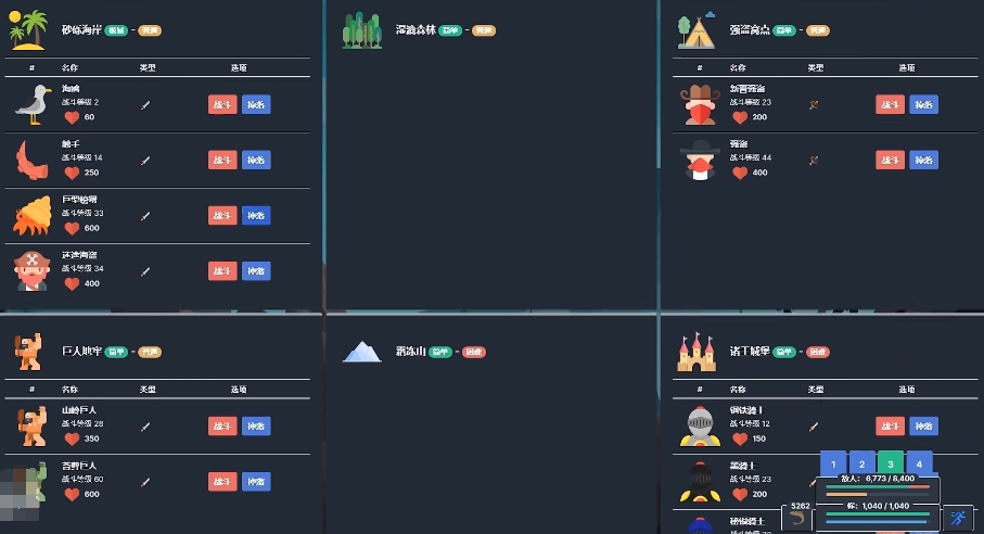 大家是可以在标注的文字地图上面看到各种野怪的,但是一般想要更多资源还是去参与副本,在副本宝箱中会存在多种奖励,以及最后的屠杀者是目前难度最大的,而且在上面大家是可以通过放置来进行战斗的,包括各种资源的获取也不用玩家亲自来肝啦。