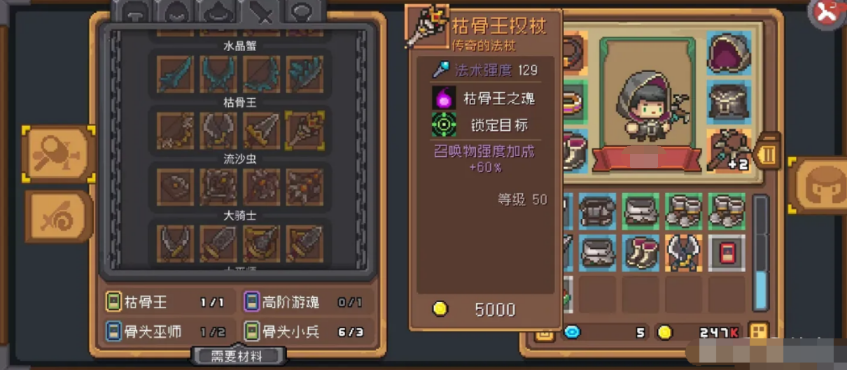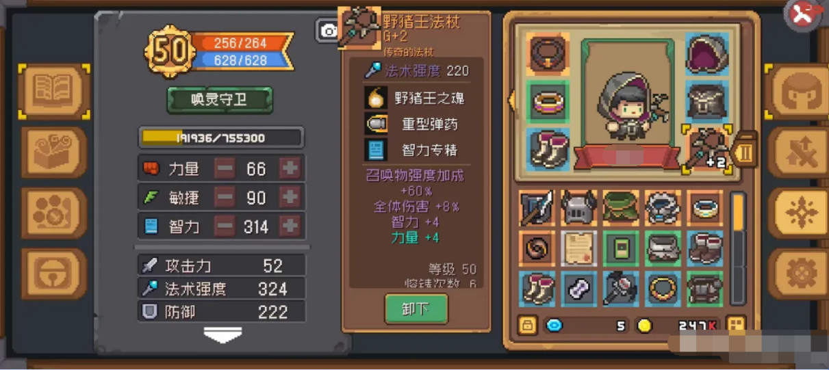 召唤流的武器选择是:主武器野猪杖,副武器骷髅杖。这两种武器都是以蓄力的方式来召出野猪和小骷髅,并且还会在召唤物身上映射自己的属性,非常适合召唤流。召唤流的羁绊选择是:统帅力和羁绊召唤。统帅力可以提高召唤小怪的总额,羁绊召唤可以将武器上的所有羁绊视为已经集满三层,增加阵容的强度。