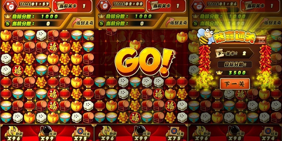 《新春消消乐》是一款喜庆感非常足的作品,里面所有的消除目标均是新春里常见的物品,例如灯笼、福字等,界面画风也以大红为主,让玩家在游玩时能感受到浓郁的新春氛围。而且游戏采用了最为传统的消除玩法,没有太多额外的地形和体力限制,只要玩家能达成目标关卡所需的分数,就可直接通关,使得游戏玩起来会令人觉得十分轻松。