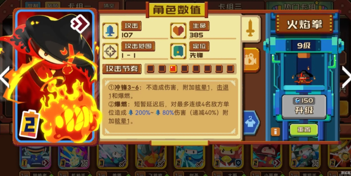前排第二个角色火焰拳则主要负责AOE输出,它的定位是快速清理前排扎堆的脆皮,这点从它的技能就可以看出,冲锋3~6可以分别附加一次眩晕,击退和爆燃效果,非常好的对敌人进行了控制,后续的“爆燃”还能连续击打四名敌人并附加眩晕,所以其技能的命中率和攻击范围都很有保障。