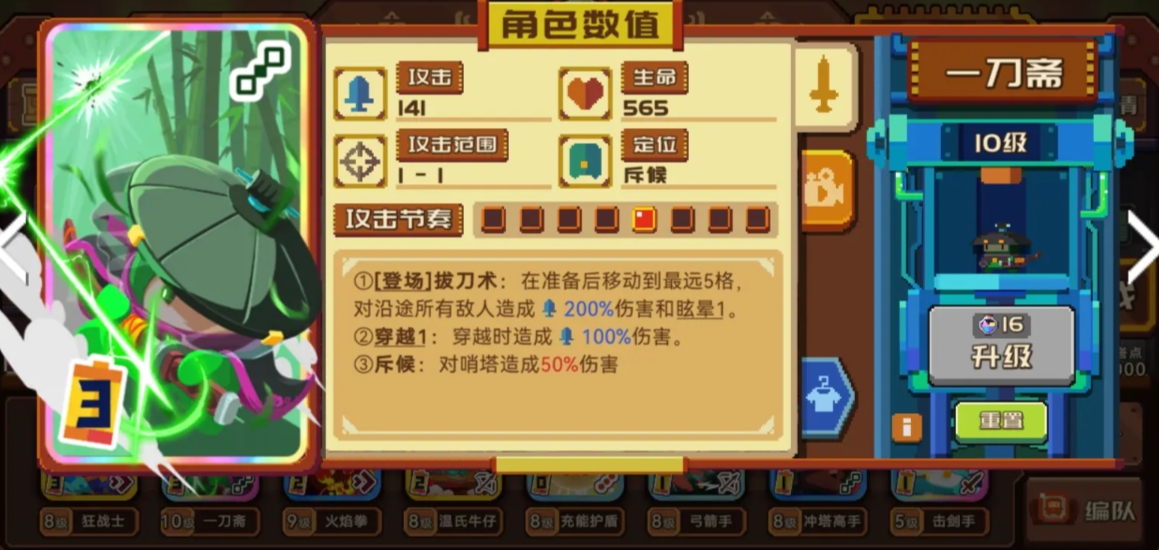然后一刀斋放在前面也可以通过拔刀术的5格攻击范围来造成AOE伤害,除此之外,其定位还有一个绕后输出的标签,这主要是因为拔刀术除了能造成五格伤害以外还有一个超远的位移,配合穿越的伤害和斥候对哨塔的额外增伤,无论是清理群体敌人还是清理哨塔都会非常实用。