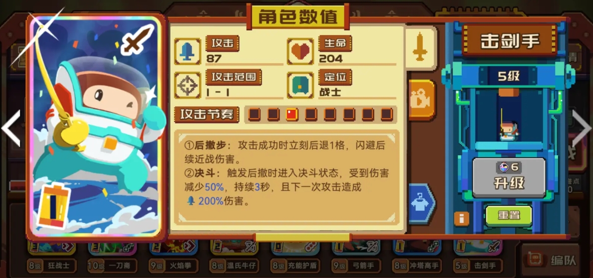 其中前排角色为狂战士,一刀斋和火焰拳,其中狂战士是一个属性非常均衡的先锋类角色,它在队伍中的定位是在前方通过单挑清理敌人,其技能非常厉害,可以造成150%的高数值伤害,而且还附带一定的眩晕和击退能力,很好的牵制了对手,并间接保护了友军。