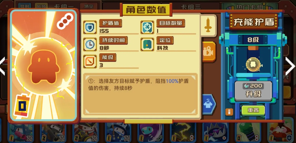 后排的话则是由“温氏牛仔、弓箭手、击剑手、充能护盾、冲塔高手”这五人组成,不过它们有的是负责输出,有的则是负责辅助,其中充能护盾的重要性很高,它能选择单体队友进行加盾,进而保障了队友的生存,也间接增强了队伍的坦度。