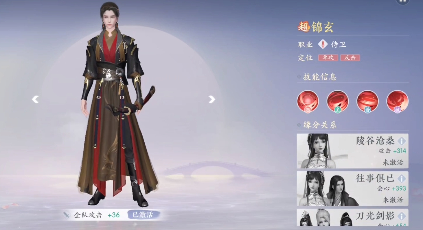 锦玄:这是十分英武神气的一个强力男角色,作为侍卫的他更擅长于进行近身的单体攻击和反击,技能方面,怒攻可以朝着敌人突进并对最多三名敌人造成伤害,伤害他们的同时锦玄自身还会获得攻击力提升的buff,这个buff持续的时间很长,基本上全场下来都可以一直生效。