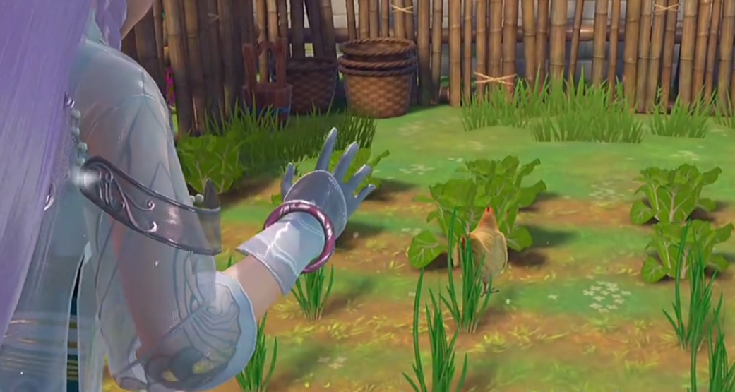 第4只鸡是阿秋来到了小石桥方向,向前走8步,然后再右转直接下石梯,此时就来到了花莫村(537,484)处,就可以直接找到。而第5只鸡需要来到宅院湖边的石头旁,这时候正好位于花莫村(470,578)处。