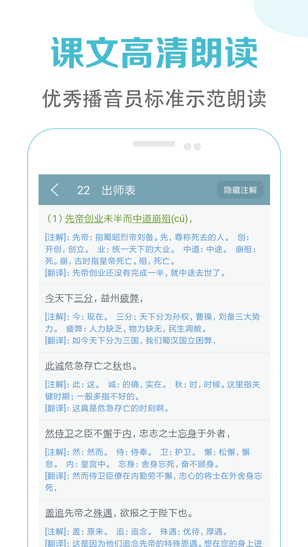 这款软件中有着非常准确的语音课文,通过这款软件的学习和使用,可以帮助广大的学生朋友们矫正自己的语文口音,对于一些古诗古文类的文章,还能帮助大家认识通假字,读对读准对应的字词。这款软件的使用率目前来说还是很高的,可以先下载体验一番。