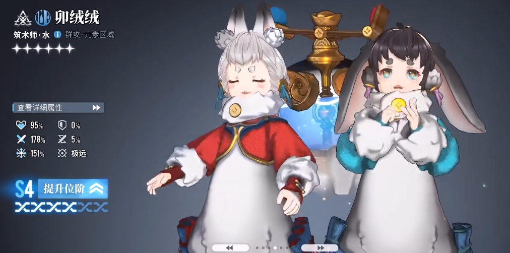 卯绒绒:这是游戏中为数不多的双人角色,其中有一个角色的头发是白色的,角色原型无论从名字还是形象都可以看出是兔子,她也是游戏中为数不多强度能到T0的角色。