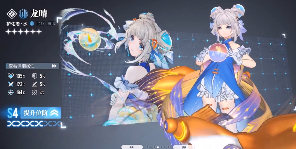 龙晴:她是一个梳着白色丸子头的女角色,本身负责的是治疗和加盾两项职能,一技能为“子非鱼”,是一个主动施放的技能,可以对全体友军提供护盾,护盾存在期间还能提供减伤效果,并且护盾失去后还可以提供回血和反击,可谓是集合了回血,加盾与输出为一体的神技。
