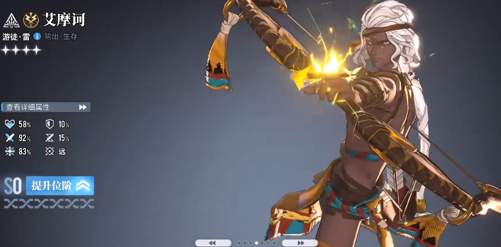艾摩诃:他是一个有着白色长发加辫子的黑人小伙,手中拿着弓箭,标签是输出和生存,看上去非常具有部落风格,技能的话则也都是围绕射箭来进行设计,一技能“爆裂”的效果是对前方射出五只弓箭,命中后可以对敌人附加雷元素损伤,而且一段时间后还能对敌人造成额外的雷元素伤害,并且期间敌人的投射物都会被直接摧毁!