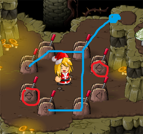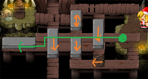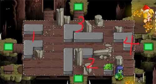 这个区域有一个谜题,需要玩家移动木箱子和石头,来点亮相应的灯光,才能打开通往下一个区域的门。这个谜题比较简单,只要按照如下的步骤,就可以轻松解决: