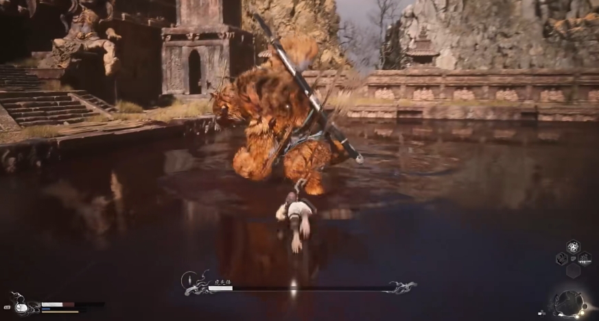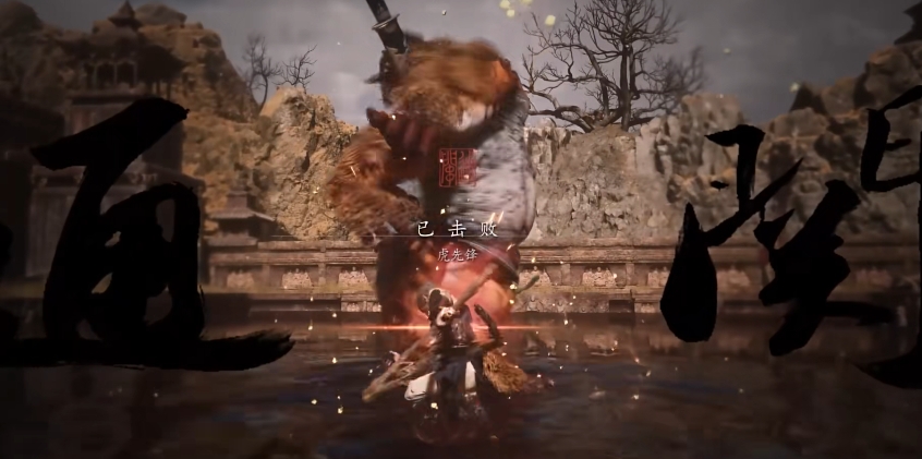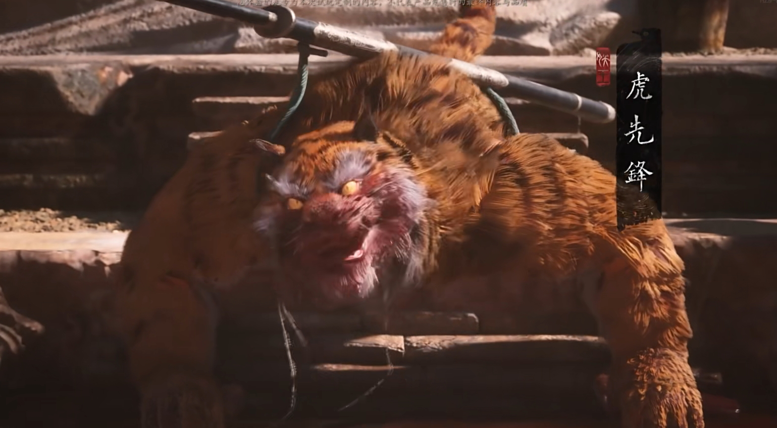 另外它还会使用剑气三连,以及蓄力斩击这些常规招式,前者可以通过轻棍积累棍势后用重棍直接硬刚消解,后者则需要在蓄力时就提前做好准备以此翻滚躲避,另外虎先锋还有着“气旋”和“硬化”两个技能,前者是通过挥砍制造一个黑色气旋,气旋速度不快,直接走位躲开即可,后者则是让自身变得坚硬,这个状态下不去攻击boss,等技能时间拖过即可。