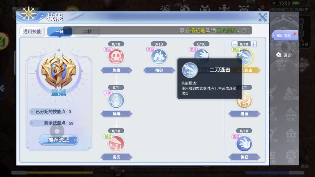 首先盗贼是一个高爆发高攻击力的职业,他的属性分别是力量、体质、幸运、智力、灵巧和敏捷。新手在达到10级之后一转才可以进行职业转职,转职之后我们选择盗贼,还可以根据自己的喜好选择发型和性别。