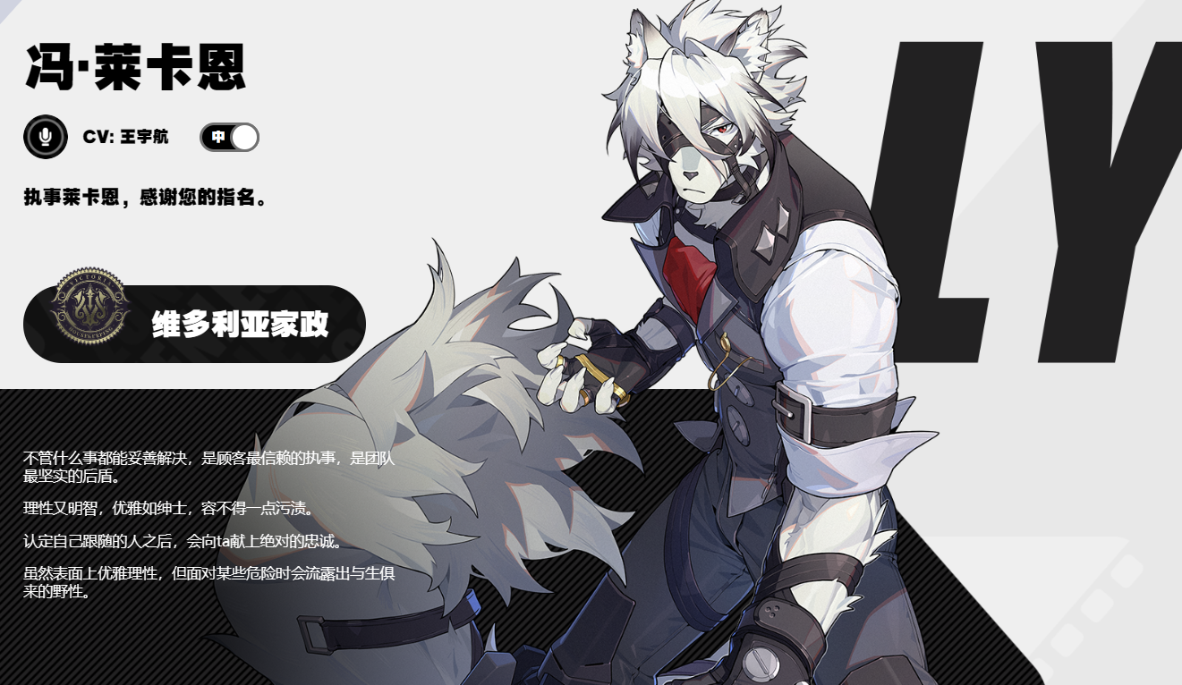 第七个叫做叫做【莱卡恩】。莱卡恩是一名白发的狼人角色,在游戏中的莱卡恩是一名执事。在高职业素养的莱卡恩口中,是凌厉的攻击,和在战斗中不停挠动的爪子和强力的腿部攻击!莱卡恩常常面无表情示人,但是在战斗当中,热血和激情会让莱卡恩释放出他真正的一面。