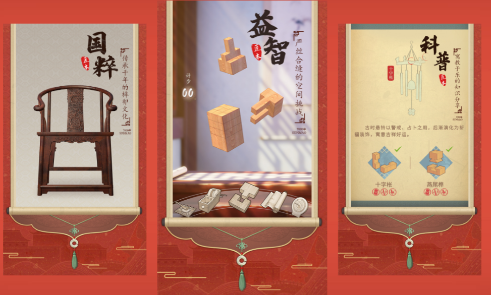 该游戏过展现中国古典木工艺,让打家领略千年传承的卯榫技巧,创造出精美的木制品。每个关卡都是一个充满挑战的独特体验,需要玩家发挥空间想象力和逻辑思维,将木材按照卯榫的原理巧妙拼接成指定的形状,从而解锁更多的关卡和木工艺品。游戏以其精致的画面和优美的音乐让玩家仿佛身临其境,沉浸在古代木匠的世界中,感受他们独具智慧和艺术的精神。