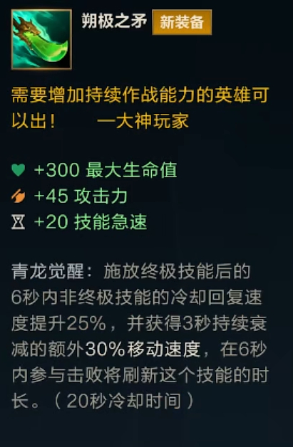 最后一件新装备则是“塑极之矛”,基础属性是300血量 45攻击 20技能急速,它非常适合持续输出型的战士英雄,因为属性给的较为全面,被动“青龙觉醒”更是能让大招施放后的非终极技能获得额外25%的冷却回复速度,以及3秒持续衰减的30%移速提升,这个效果简单来说就是大招放完后你的小技能可以好的更快,同时移速也能提升,变相的算是增强了持续爆发能力。