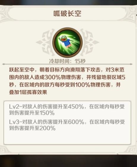 悲伤蛙的属性主要以攻击见长,它的破甲属性也十分不错,非常适合担任队伍的输出主力,技能方面,一技能是“呱破长空”,效果是跳到空中朝目标方向进行下落攻击,落地后会造成三倍攻击的AOE物理伤害,并且落地区域的敌人在之后五秒内会持续受到额外物理伤害,同时还能叠加一层孤寡效果。