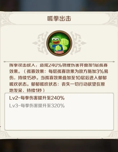 二技能是“呱拳出击”,效果是挥拳攻击敌人造成一定物理伤害并叠加一层孤寡,孤寡效果可以让敌人被附加持续15秒的3%易伤,同时叠加到十层后还能让敌人陷入郁郁呱欢,从而在原地发呆一秒。