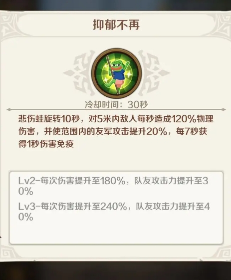 三技能是“抑郁不再”,效果是旋转十秒并对附近敌人每秒造成一定伤害,同时令范围内的友军获得20%的攻击提升,并且还会给予他们每七秒一次免疫伤害的加强,这招同时增幅了攻防,由此可见悲伤蛙对于队伍的提升非常全面。
