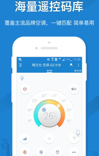 该软件适配各种空调电视机型号,内置8万多的离线遥控器码库,即使没有网络的情况下都能够对各种家电进行遥控,包括对空调制冷或制热以及调温度,还支持清新、除湿、节能等模式。