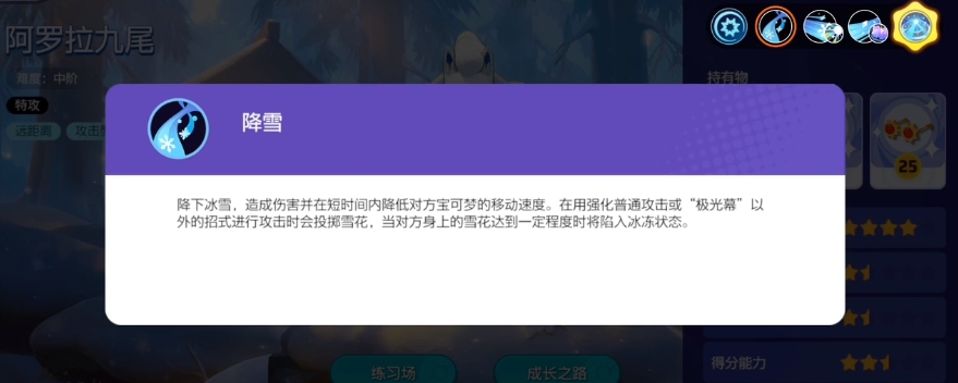 在普通攻击上九尾是没有什么特殊效果的,但是在第三个普攻上面是可以带来强化效果的,而且在进行输出的时候周围的宝可梦都会受到影响效果在移动速度上面减缓,技能细雪则是一个基础的攻击技能,使用的时候跟上面的强化效果一样是可以减缓对面的移动速度的。