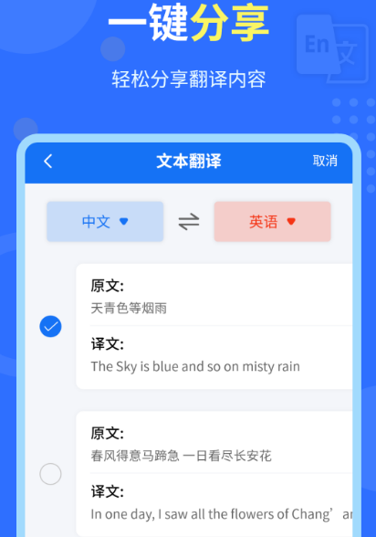 不管是有中英文互译方面需求的人,还是想要将中文翻译成其他的语言,该软件都是非常不错的。具备一键分享选择语言拍照翻译,文本翻译等诸多的功能,可根据需求选择。
