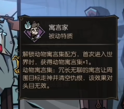 在创建角色时,可以选择动物寓言家的身份,这样就可以解锁寓言集的特质,使用后可以瞬间清掉周围怪物的仇恨。这是最简单的获取方式,但是也意味着你放弃了其他角色的特质孰轻孰重大家自行取舍。动物寓言家在带的寓言集自然能提供非常不错的前期帮助,但也牺牲掉了角色特性,因为预言集在后期还能通过其他途径再次获取的。但大家注意下动物寓言集是一种消耗品,每次使用后都会损耗一定的耐久,当耐久归零时,动物寓言集就会消失。而且在召唤小弟之后对其在成伤害的话则会打断结盟状态,不存在无伤取肉等情况。