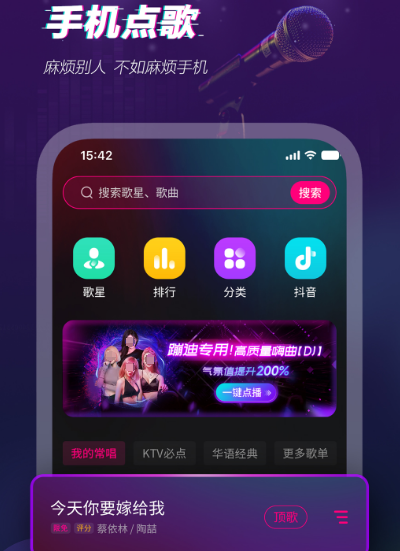 想要k歌就来到这款软件,作为ktv歌唱神器可以直接与ktv的设备相连接,并进行扫码点歌,另外还有影院电影派对等多种不同的功能,超多玩法让你high爆全场。其中有着超级齐全的曲库,另外也可在家里自己嗨唱,其中有超多音效,选择自己喜欢的音效,轻松学唱歌,为你打开艺术之门。