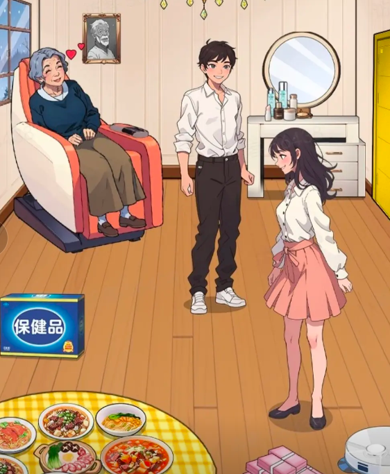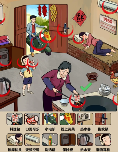 通关物品:料理包【宫保鸡丁】,口渴可乐,小电驴,线上买菜,热水器,指纹锁,按摩枕头,变频空调,洗洁精,保险柜,热水壶,潮流耳机;