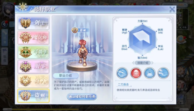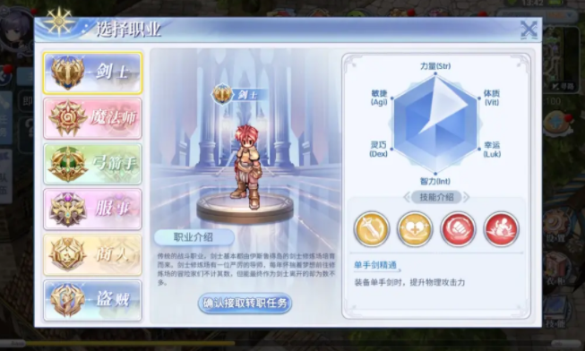 玩家可以根据自己擅长的战斗类型选择对应的职业,对于新手玩家来说,剑士是最推荐的一个职业,因为人物整体比较全面,攻击和防御能力都有,如果玩家在平时玩游戏的时候喜欢和敌人正面硬钢进行对抗,那就可以选择剑士,等到四十级之后还有机会转变成其他的职业。