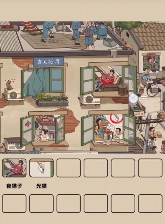 在光猫的上方还坐着一个红衣服的男人,看上去十分的萎靡,点了后才知道原来是夜猫子,熬夜对身体不好,小伙伴们千万不要学他哦。我们把视角拉大,可以看到有一群小孩在玩耍,他们的附近有一个熊猫垫子,非常的可爱,熊猫也是猫嘛。在将视角向下移动,我们还可以看到一群小孩在看小叮当,机器猫也是猫嘛,这可是不少小伙伴们的童年回忆呢,不知道是不是你的呢。