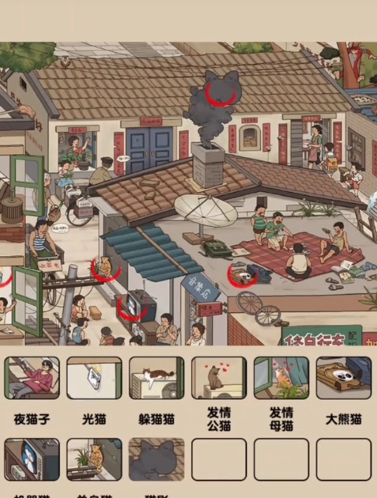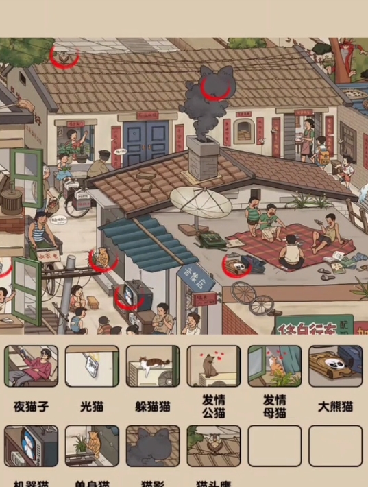 在看电视孩子上方的电线杆上还坐着一只正在打盹的猫,看起来过的不是很好啊,不知道有没有小伙伴会对他产生同情呢。村民门做饭时出来的烟雾也成为了一只猫,看起来十分温馨呢。电线上面还站着一只猫头鹰正在睡觉,猫头鹰要在晚上才会活动哦。右边的书上还有一只猫,应该是致敬了汤姆,这也是不少小伙伴的童年呢,最后村民的门上还有着一只猫眼,这样12只猫就找全了。