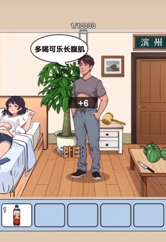 首先我们进来的时候会看到有一个身体强壮的小哥和他的妹妹正待在家里面,这个时候我们将小哥头上的灯拉下来就可可以找到一瓶生可乐,接着我们再掀开小哥的衣服就会发现小哥的腹肌居然是假的,在这里就可以得到六瓶生可乐,这个时候小哥还会来上一句多喝可乐长腹肌,看来小哥对于找喝可乐的借口可谓是无所不用啊。