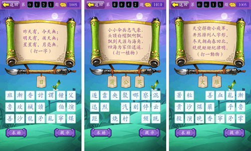 《谜语合集》是一款很有趣的益智解谜类手游,可以跟家人一起猜谜,感受中国文字和传统文化的魅力。游戏拥有丰富的题库和上百关卡,这里没有刺激的决斗只有烧脑的解谜盛宴,在闯关的过程中还能潜移默化的增加语文知识,轻松欢快的背景音乐,让你跟家人们一起抢答猜谜充满欢声笑语,能够迅速升温家庭成员之间的亲情。