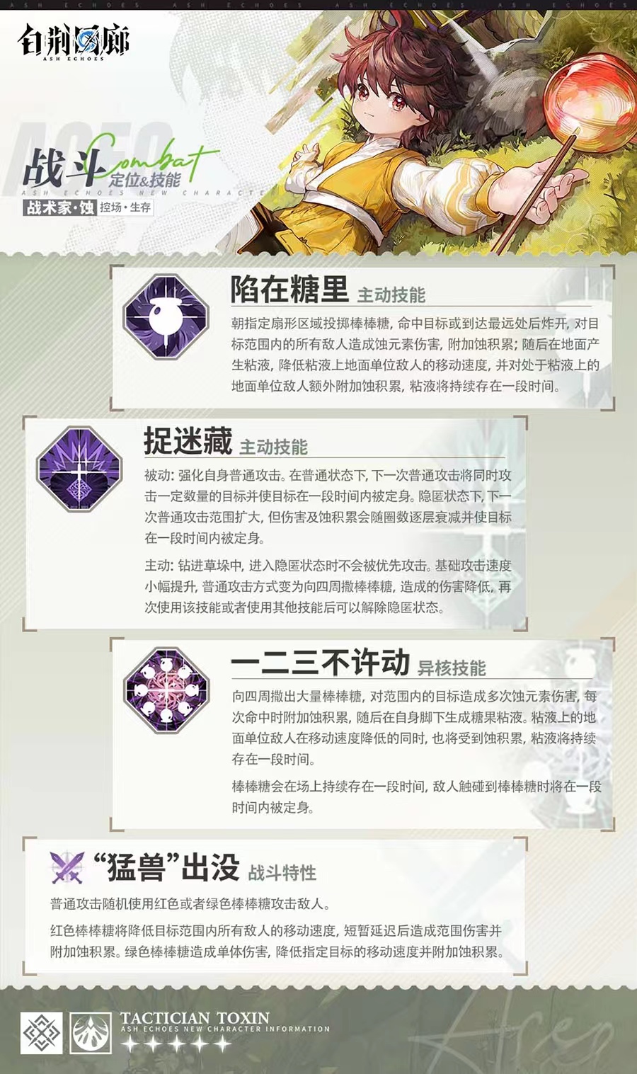 最后一个阿棘在游戏当中也是一个辅助型的职业角色,他的技能可以让对面行动受到限制,减速他们的移动,同时还能对他们造成额外的控制效果。这个在游戏前期时可以帮助玩家们顺利通过很多的关卡,而且他自身的一个烙印是比较容易触发的,在触发之后敌方受到伤害会额外增加60%。