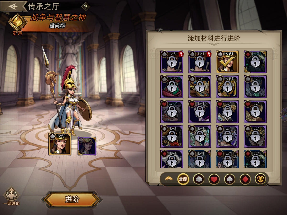 但要注意,每位角色只能用于自己同花色的角色卡牌进行提升,并且在进阶时所需要耗费的卡牌要与角色处于同一品质,而且在一些特殊阶段时,只能使用同名角色卡牌作为提升素材,所以玩家应尽量多攒些英雄卡牌,避免出现角色满足条件但进阶素材不足的情况。