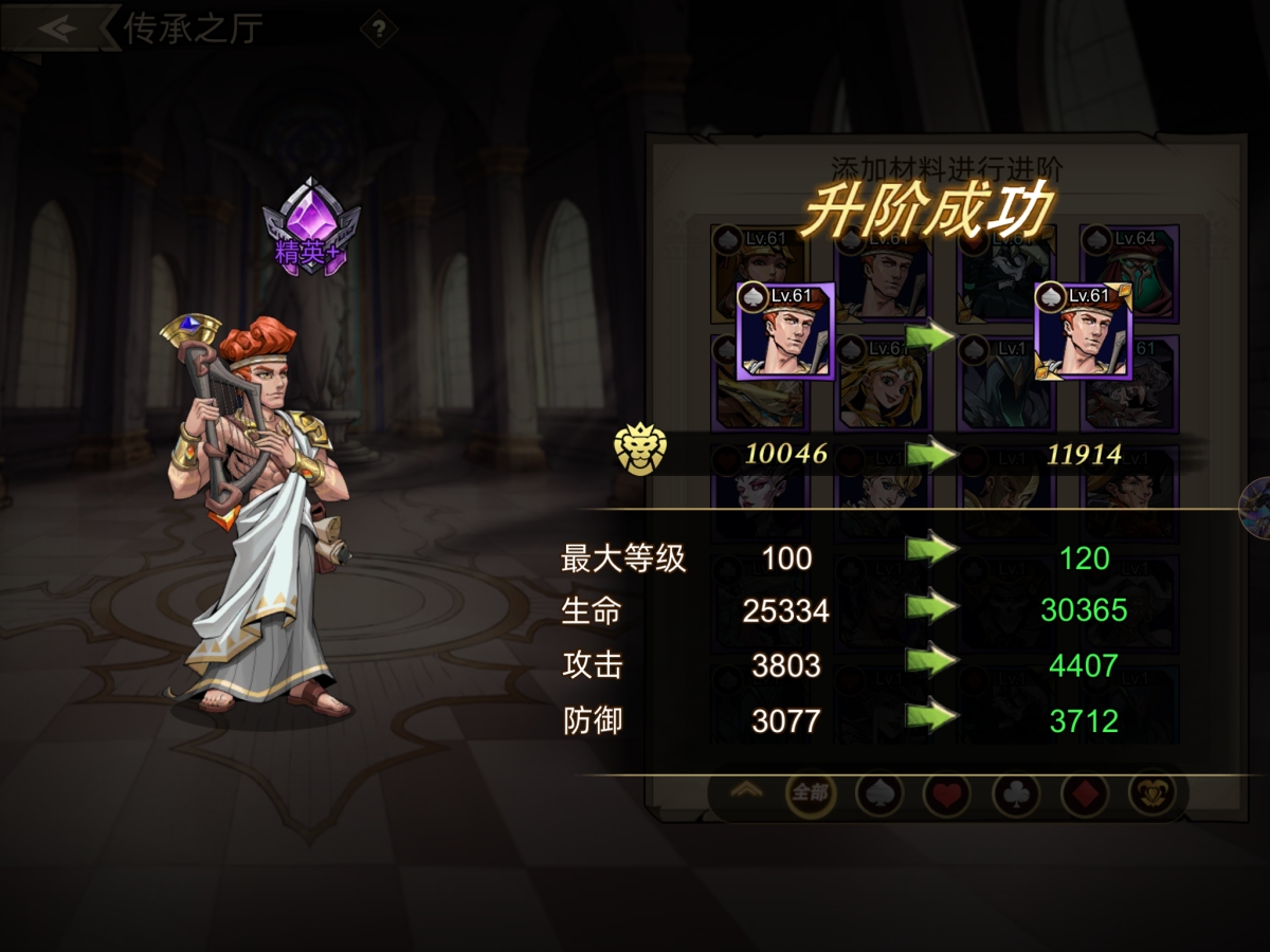 两种进阶方法分别为职位进阶和角色品质进阶。其中角色品质进阶很好理解,就是通过给角色喂食相对应的角色卡牌,不断提升角色的品质,直到角色的品质达到最高为止。该玩法可在传承大厅中找到,完成进阶后会让角色的战力、属性得到大幅度的提升,其边框颜色也会发生改变,方便玩家们进行区分。