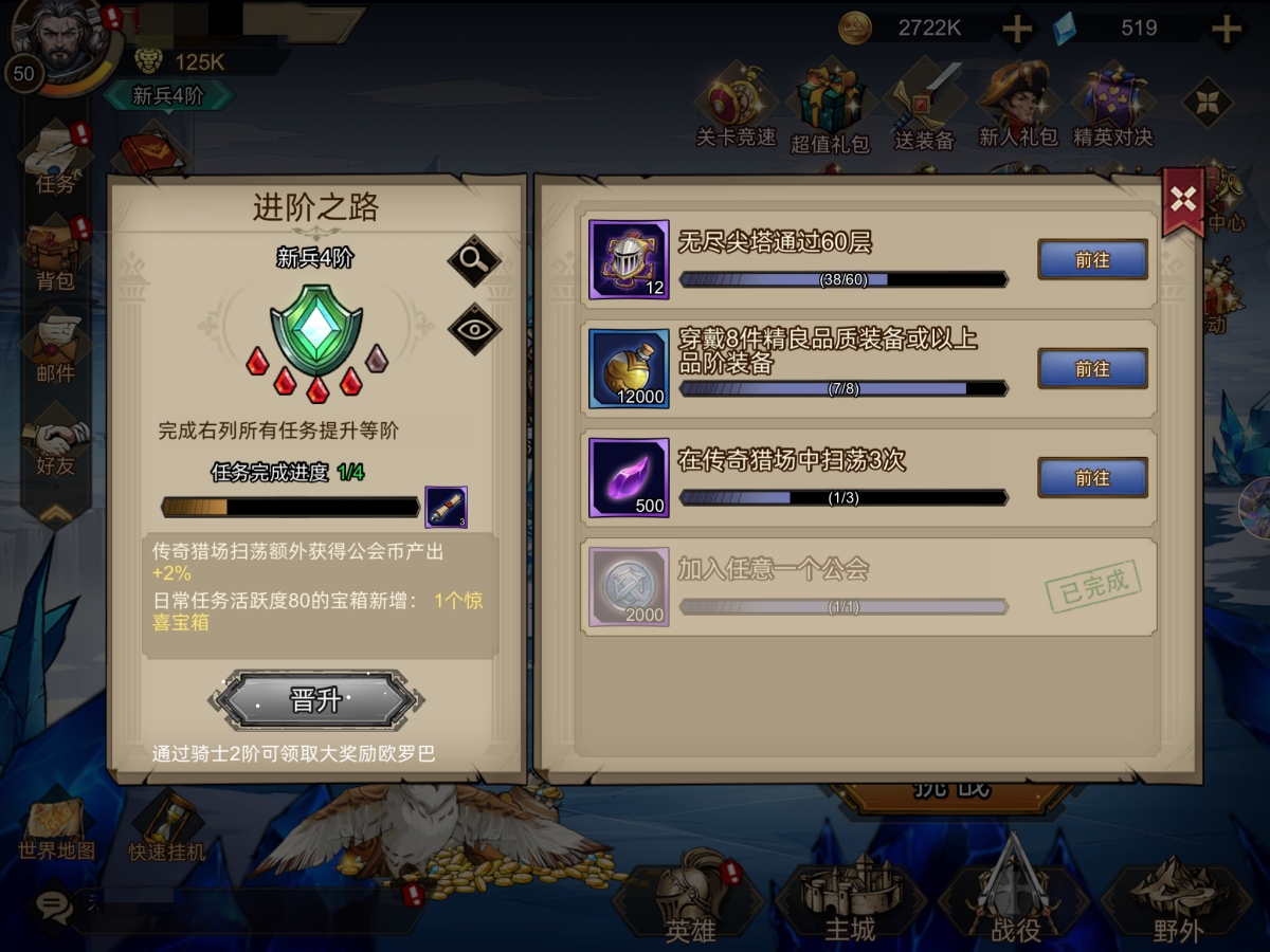 职位进阶则是会给所有角色带来属性方面的加成,其提升途径为进阶之路,只要玩家将当前阶段的任务全部完成,即可成功进阶职位,在获得加成的同时还能领取到相应的职位奖励。并且进阶之路中的任务难度不是特别高,基本上都以推关、推塔等游戏进度内容为主,玩家可考虑优先做完。
