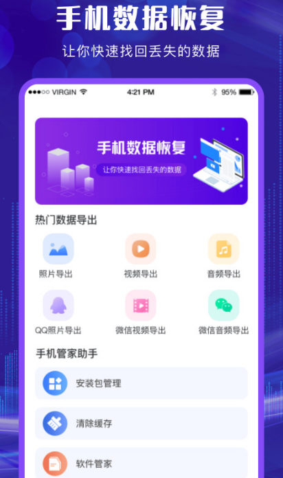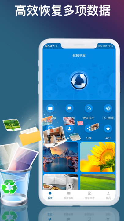 如果用户不小心将自己重要的数据从手机删掉了,比如在qq、微信等通讯录当中所拥有的重要视频或者是照片,这一个软件就能提供数据恢复功能,也提供数据管理功能,重要的文件或者是照片,基本上在几秒钟的时间内都能恢复,无需扎根手机,只需扫描设备就能发现恢复丢失的各种文件数据。