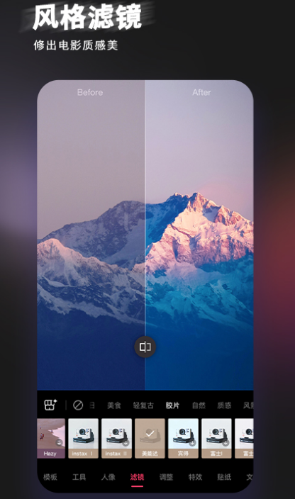 如果有修图需求的人,相信都希望通过添加高级滤镜的方式,让每一个图片充满质感,该软件就有很多高级滤镜,尤其是人像照片利用高级滤镜的改变,可将整个人像照片变成全新的样子,还具有网红特效,个性贴纸打开软件以后,拥有全新的界面,可根据自身的需求来选择适合的工具。比如网红特效,这样的功能让用户通过选择好看的特效,也拍一张相同的照片,并不会有违和感。
