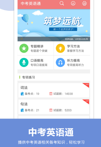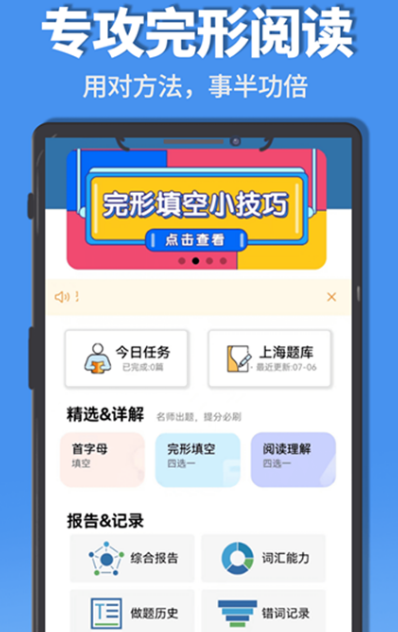 初中阶段英语也是非常关键的一部分,这款软件轻松帮你提升英语分数,具有基础知识词法词汇,完形填空等多种不同的板块,另外还有作文专题。
