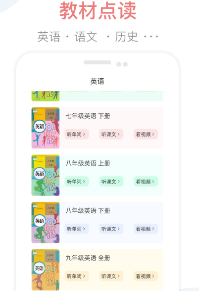 初中教材听着学,有课本朗读功能包含的科目相当齐全,比如语文、英语、历史等,由播音员录制,可边听、边看、边背、边学非常高效。