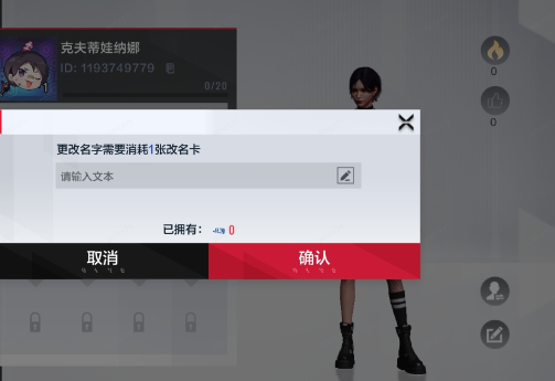 更换头像之后别忘记去修改昵称,再点击默认的名字之后马上就会跳出一个修改的页面,玩家可以根据实际的情况去作出修改。接着可以点击确认,一旦在确认之后就可以完成修改,每次在修改时全部都会消耗改名卡,而这些改名卡可以通过活动或者是商城来获取。