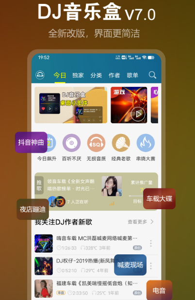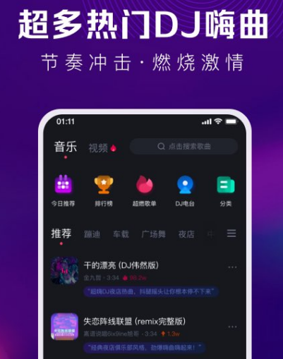 app当中有车载dj、广场舞、串烧、喊麦、电音等等。超火的dj歌单有多种不同的分类以及34个细分类挑选最嗨的dj音乐适合多种场合,包括车载、夜店。