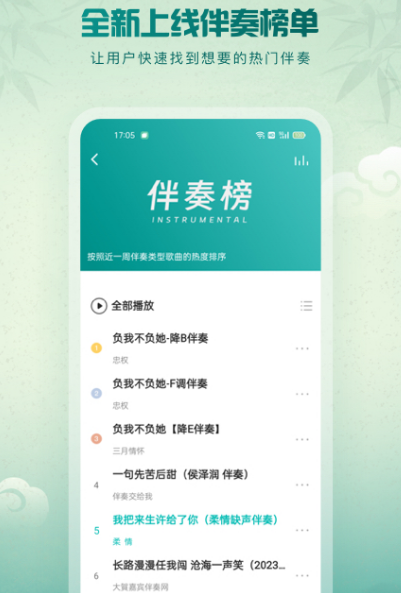 完全免费的音乐软件,无需开通会员就能快速应用歌曲较多伴奏也很多,有乐曲伴奏,升降调伴奏等等,覆盖古风、流行、民谣等。