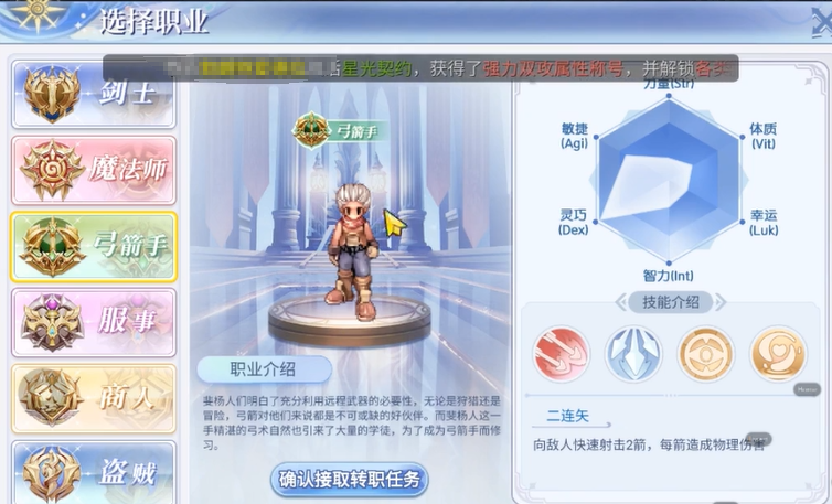 首先要推荐给大家的第一个职业是【弓箭手】,弓箭手这个职业是可以通过转职成为猎人在到神射手的!属于一个远程作战职业,自身的攻击速度和群伤非常的优秀,大家如果在游玩弓箭手的话,初期的话,可以先升级到20级,在加点属性上可以选择加到敏捷,这样可以增加自身的攻速效果,走攻速流派玩法!