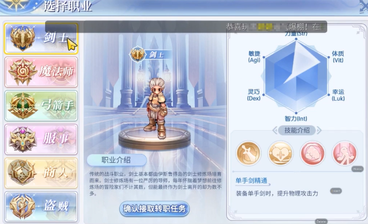 第二个职业推荐大家去选择【剑士】,这个职业非常的强,属于近战攻击中,力量属性最为突出的一个职业,力量属性可以增加角色的基础攻击和生命值,算是一个比较好养成的职业了,抗伤能力和上手能力都十分出色的一个职业!在游戏中,进行副本时,大家肯定都离不开这个剑士职业,解决了就业难题后,大家只需要在副本中跟着打,相信一定是可以获得装备的,初期如果幸运的话,掉落了好的装备,后续就可以进行转职了!到了转职玩法的话,大家如果想要养成比较轻松的话,可以选择骑士,骑士的攻击效果和剑士十分的相似,而且都是属性攻防兼备的一个转职职业;