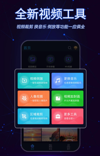 在制作视频时,如果不想花太多的时间,也不想太动脑筋,可使用该软件来完成,它是没有任何基础的人都能轻轻松松完成,上手特别容易,还有视频拼接、人像抠图、视频倒放、视频剪辑等诸多功能。